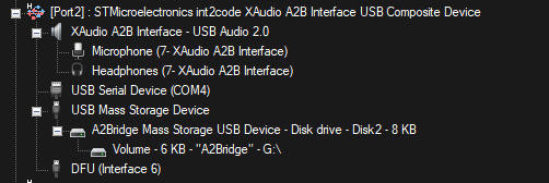 External audio device endpoints are used to transmit or receive audio data to/from A2Bridge. Mass Storage Device install in host PC as a small drive, where the configuration json file is present and can be edited. The CDC - COM port is used for console command